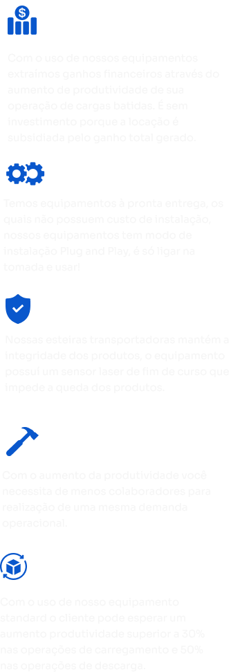 Com o uso de nossas esteiras transportadoras o aumento de produtividade é imediato, consequentemente os tempos operacionais serão reduzidos.